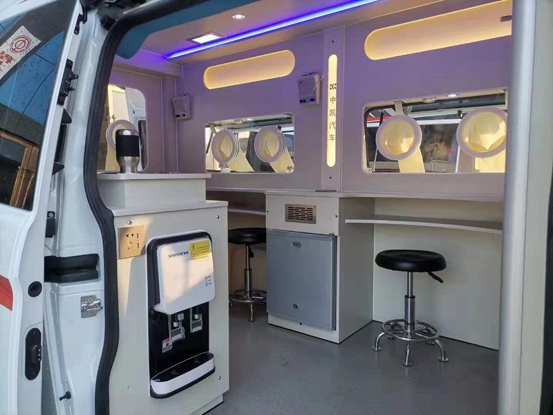 核酸檢測(cè)采樣車,采用江鈴福特推出的福特新世代全順底盤(pán)改裝。整車參考 相關(guān)行業(yè)標(biāo)準(zhǔn),集成正壓防護(hù)、溫度調(diào)節(jié)、對(duì)講、樣品傳遞、車內(nèi)消毒等功能,可迅速部署于戶外,為群體核酸咽拭子采樣、樣品登記及樣品整理提供有力支撐;在整個(gè)作業(yè)過(guò)程中確保醫(yī)務(wù)工作人員與受檢人員無(wú)直接接觸,最大限度的保障了一線醫(yī)務(wù)工作人員的作業(yè)安全,為新型冠狀病毒核酸樣本采集及樣品整理提供了防護(hù)屏障及舒適的工作環(huán)境。